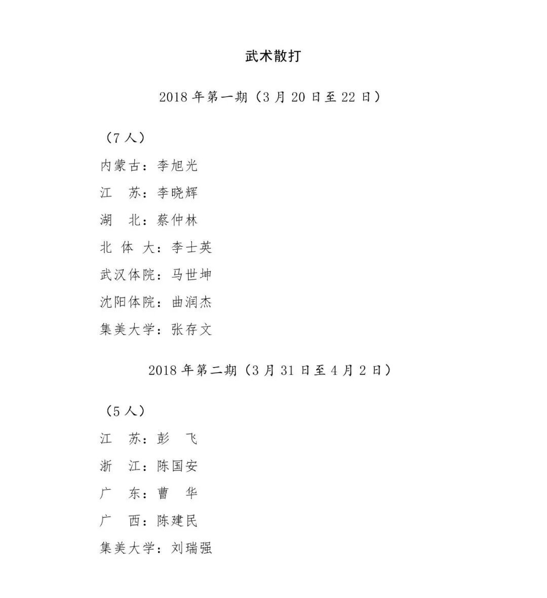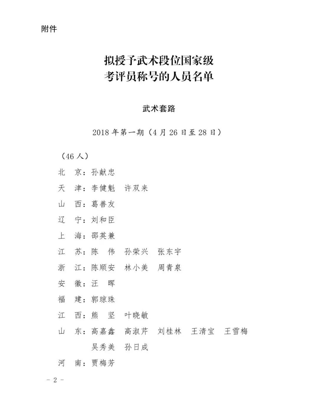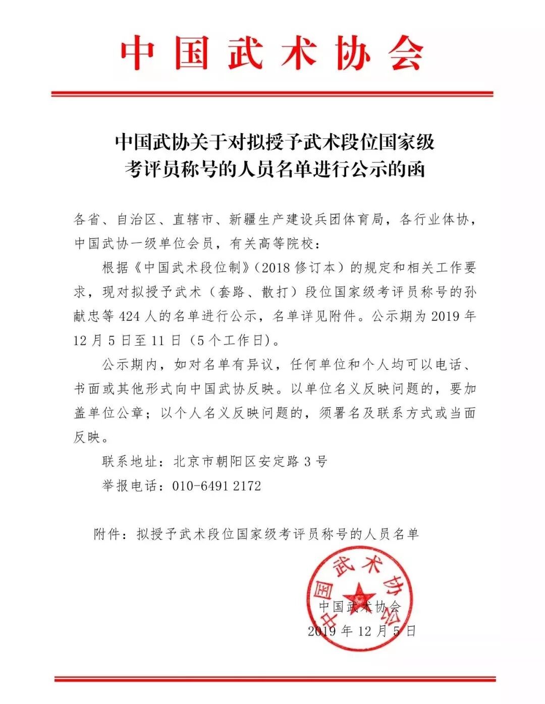 中国武协关于对拟授予武术段位国家级考评员称号的人员名单进行公示的函