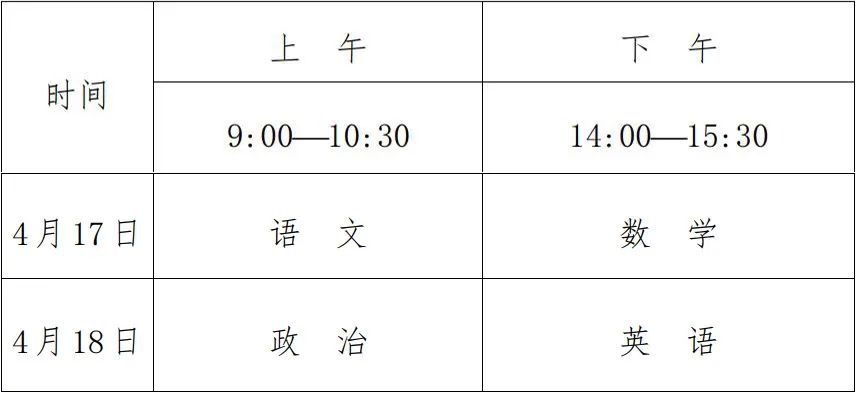 第十三条 文化考试科目为语文、数学、政治、英语四科,每科满分为150分,四科满分为600分,使用国家通用语言文字作答。